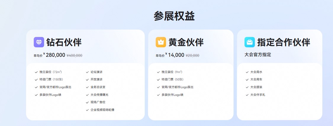 在招商合作方面,大會圍繞企業(yè)差異化需求,推出了多元化的招商合作方案,包含標準贊助、增值贊助、會務贊助三種模式。標準贊助分為“鉆石”與“黃金”兩個等級,企業(yè)可根據品牌傳播與業(yè)務拓展需求,獲取涵蓋展位展示、廣告投放、數字營銷及媒體傳播在內的綜合權益,實現高效曝光與精準觸達。增值贊助模式則支持企業(yè)圍繞特定環(huán)節(jié)進行定制化合作,強化產品與品牌露出。同時,大會還開放會務類贊助,包括飲用水供應、用車保障、伴手禮及服裝定制等多類場景,企業(yè)可靈活選擇贊助品類,實現品牌曝光與價值傳遞。