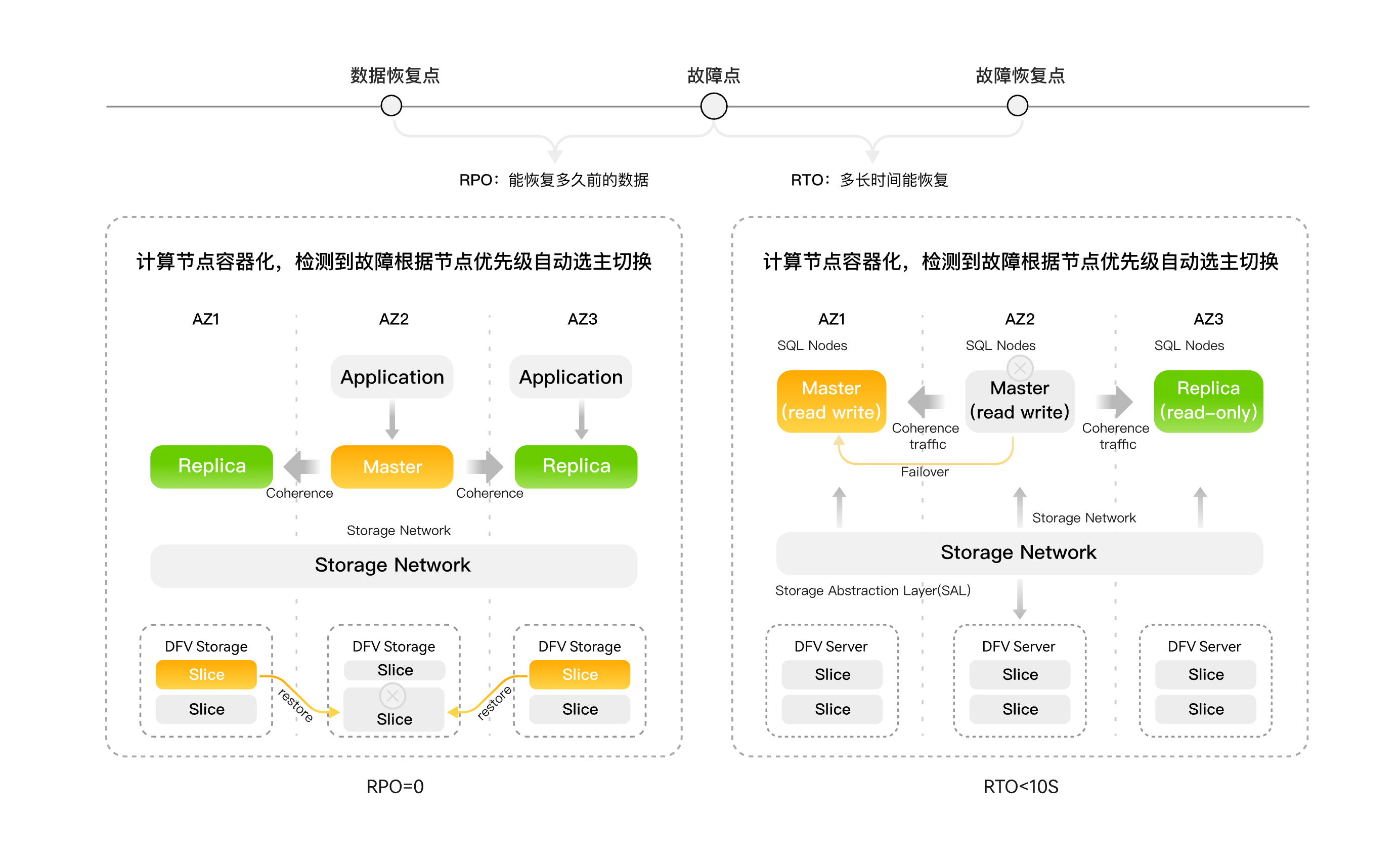 企業(yè)級數(shù)據(jù)庫的容災能力,底層數(shù)據(jù)跨AZ 3副本保存。主節(jié)點故障,系統(tǒng)實現(xiàn)秒級自動切換(RTO<10s),且保證數(shù)據(jù)強一致性。